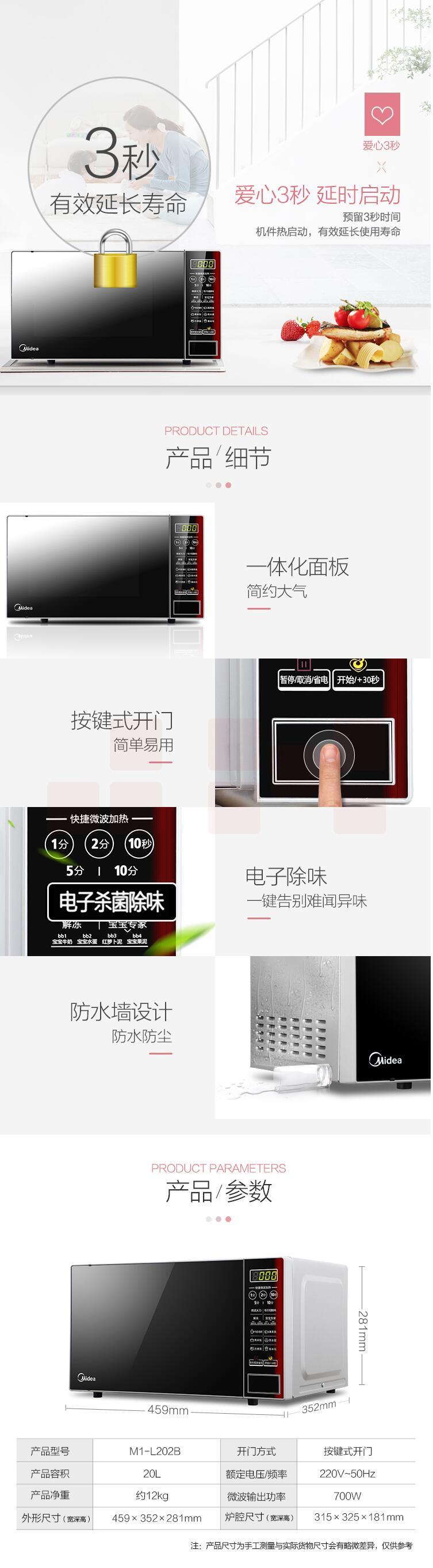 美的 20升 电子除味杀菌 快捷微波炉 平板加热一键启动 多角度反射内胆 M1-L202B