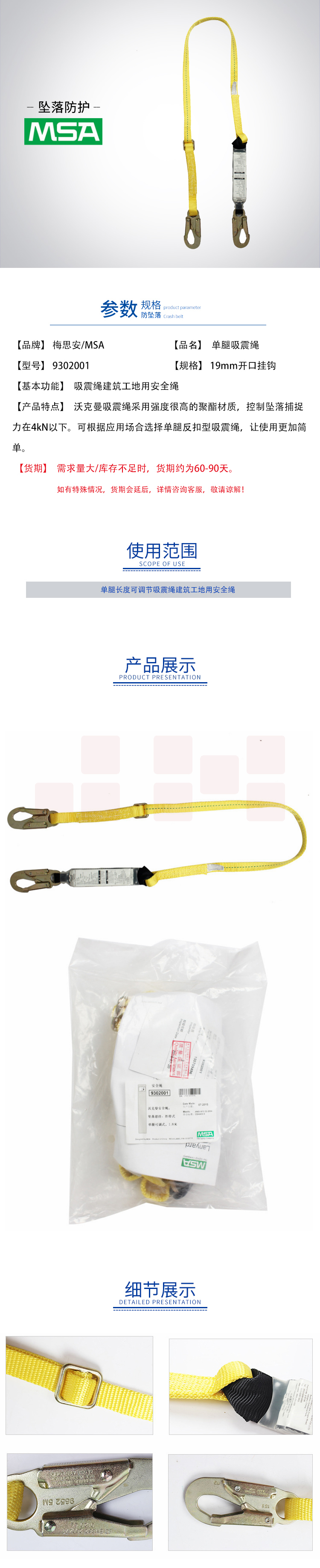 梅思安/MSA 9302001单腿吸震绳 长度可调节 两端均为19mm开口挂钩(1条)