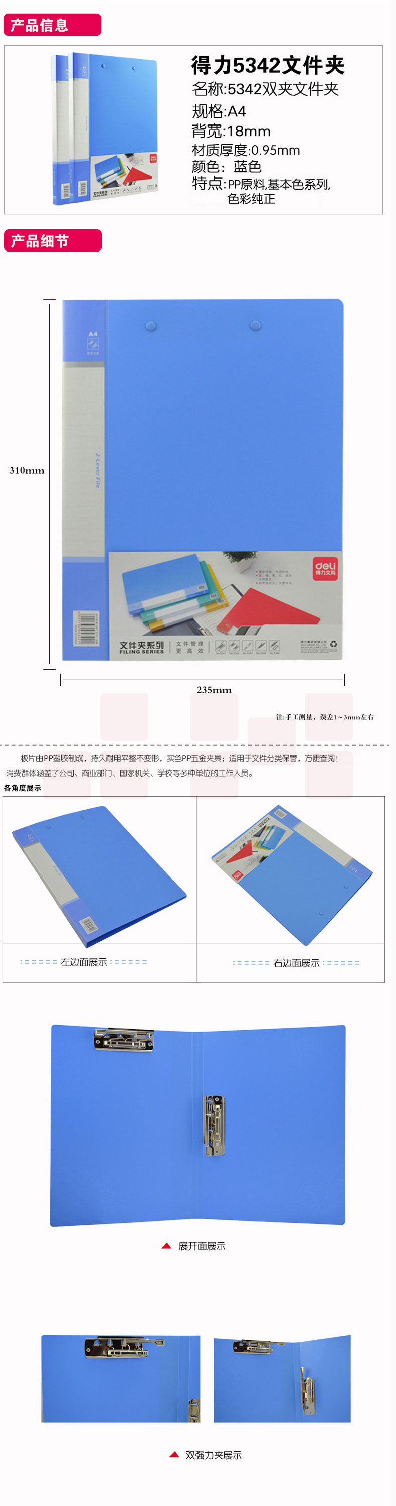 得力5342 A4文件夹 双强力夹 资料夹插页试卷夹 蓝色