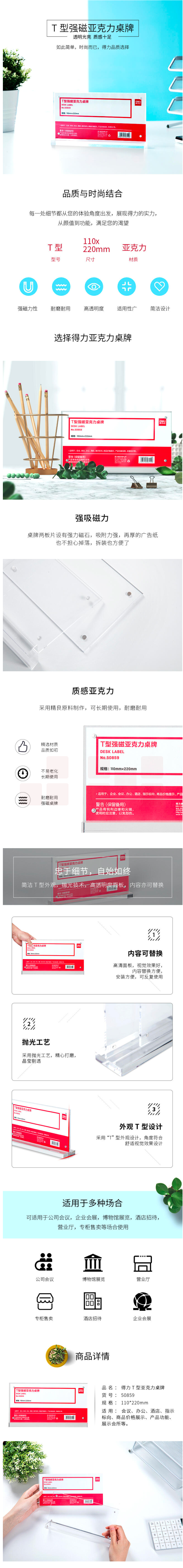 得力(deli)50859T型强磁亚克力桌牌 台卡 单面透明 110*220mm
