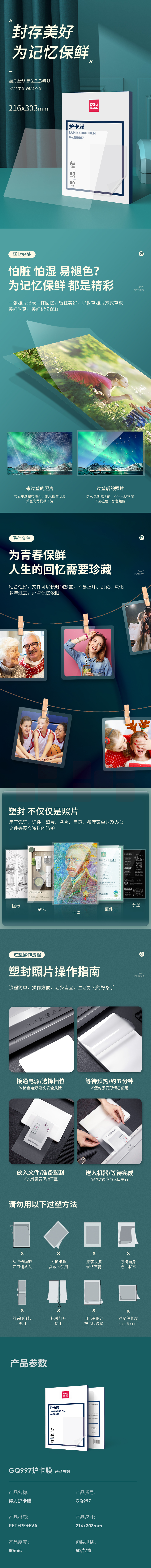 得力A4护卡膜过塑保护膜 80mic(透明白)(50片/盒)GQ997