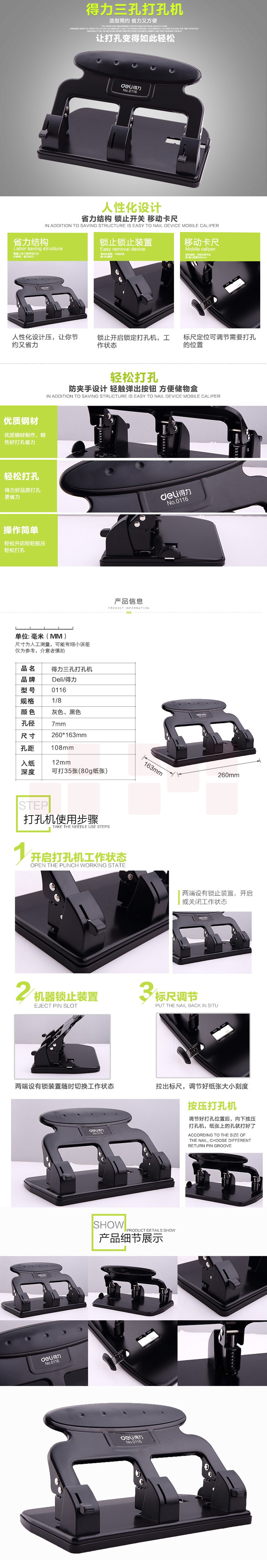 得力 0116打孔器 φ7mm孔距108mm三孔打孔机35页 黑色