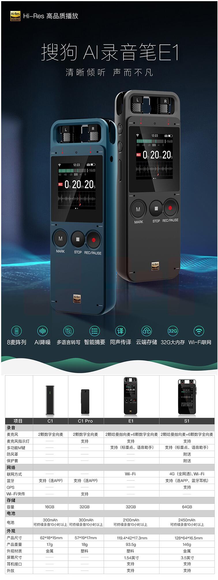 搜狗 AI智能录音笔E1 32G 高清降噪录音免费转文字