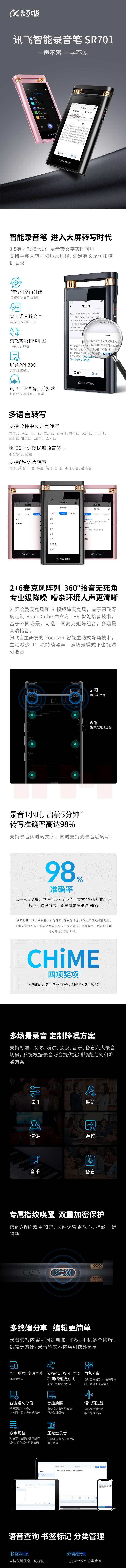科大讯飞 智能录音笔SR701 实时录音转文字中英翻译 高清降噪触屏远场录音设备 32G+云存储 玫瑰金