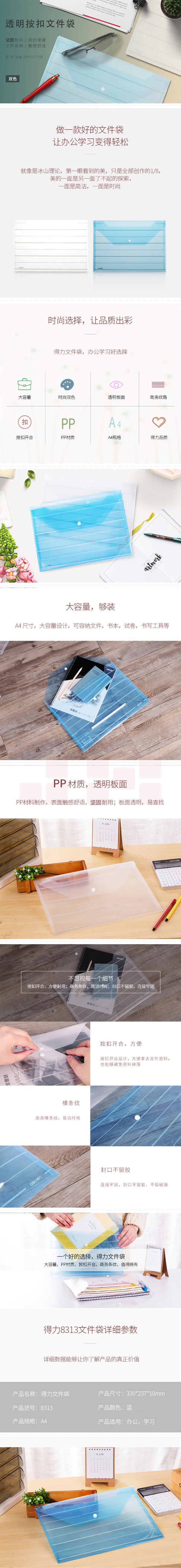 得力8313文件袋A4条纹透明文件袋 按扣资料袋 蓝