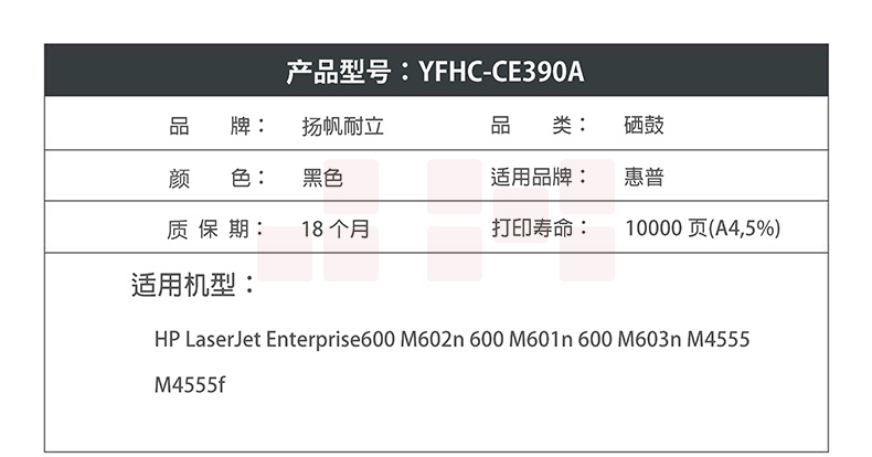 扬帆耐立YFHC CE390A黑鼓(带芯片)600 M602n 600 M601n 600 M603n M4555 M4555f