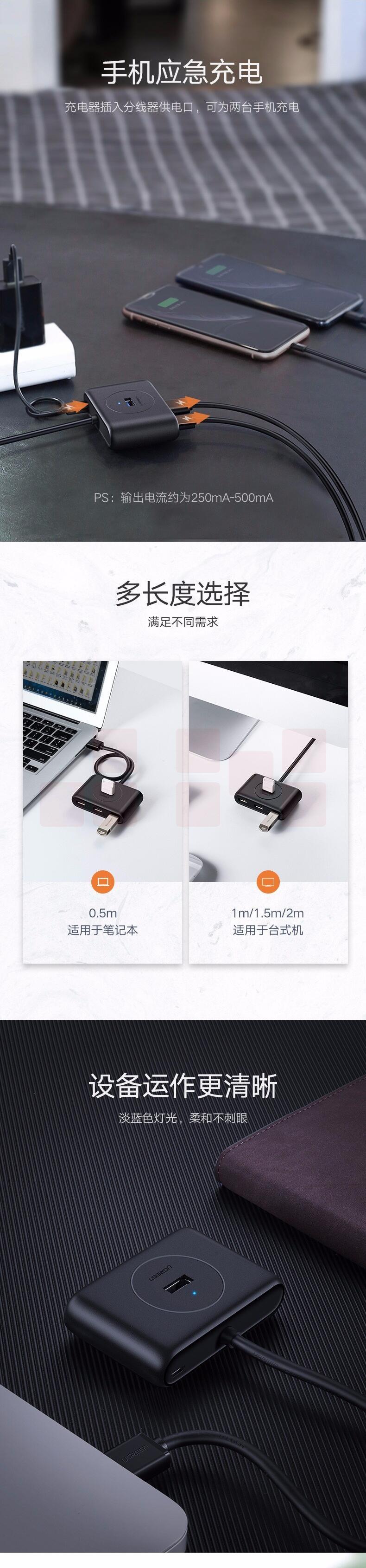 绿联USB-C分线器 高速拓展4口3.0HUB集线器延长线 台式机笔记本电脑一拖四多接口扩展坞转换器 USB款 黑色-2米