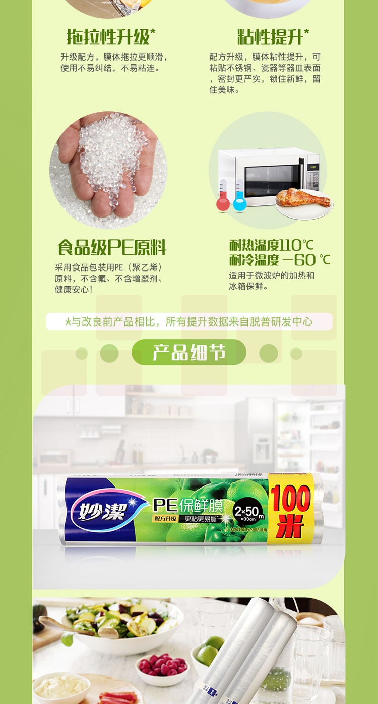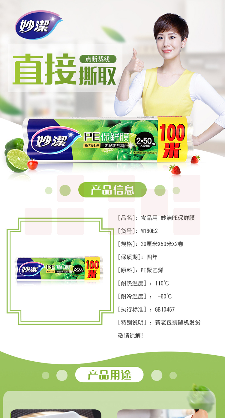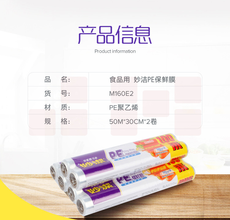 妙洁 保鲜膜超值装100米 PE材质30cm*50m*2卷