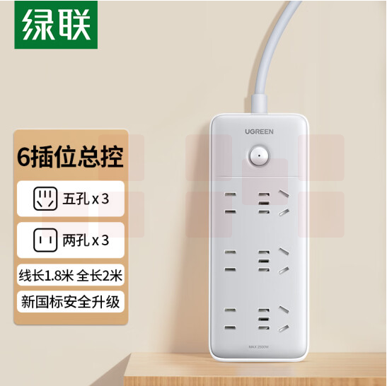 绿联(UGREEN)新国标6位总控插座 插线板 接线板 3位五孔+3位两孔1.8米 15078