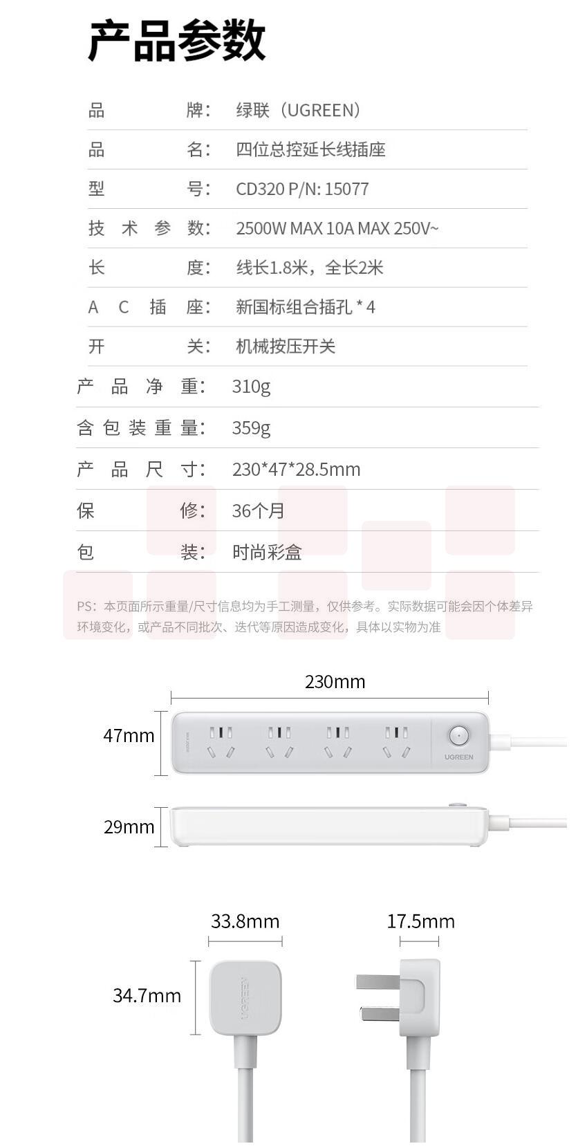 绿联 新国标4位总控插座 插线板 接线板 线长1.8米 15077