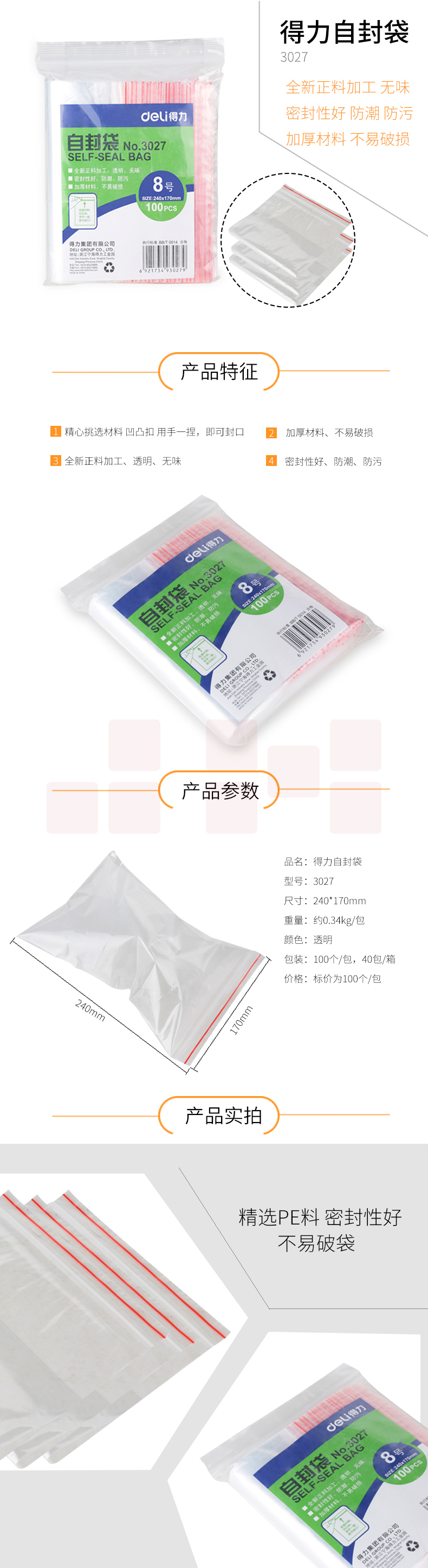 得力 自封袋 240x170mm 8号密封袋(100个/包)3027