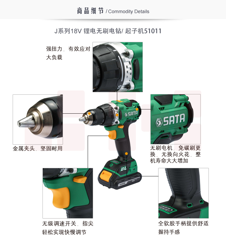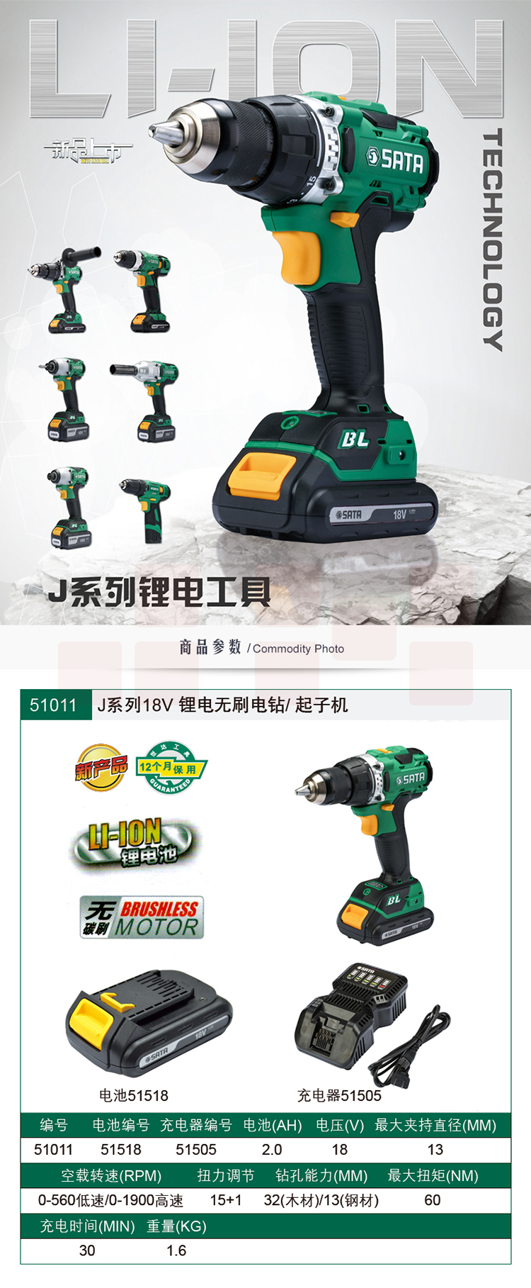 世达(SATA)系列18V锂电无刷电钻/起子机 51011