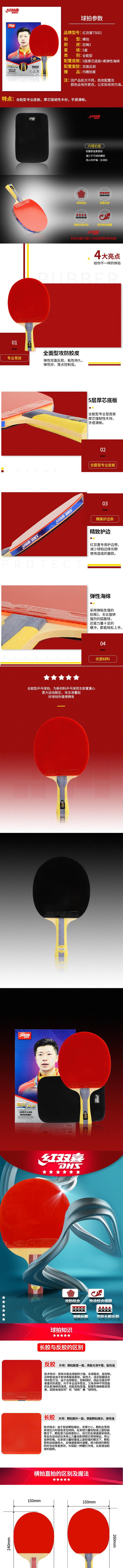 红双喜 T5002 五星乒乓球拍横拍双面反胶全能型单拍专业套胶 附新型拍套