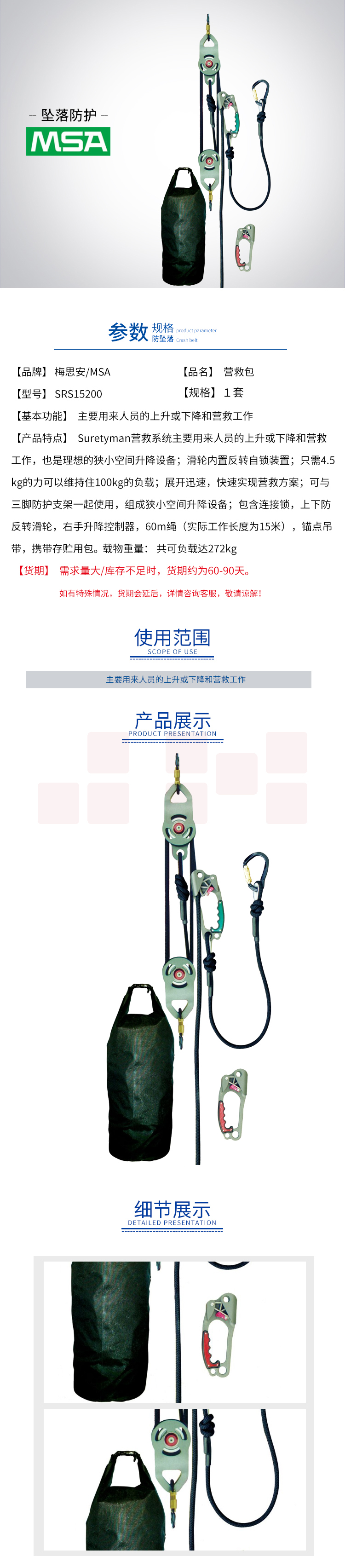 梅思安/MSA SRS15200营救包:连接锁滑轮升降60米营救绳