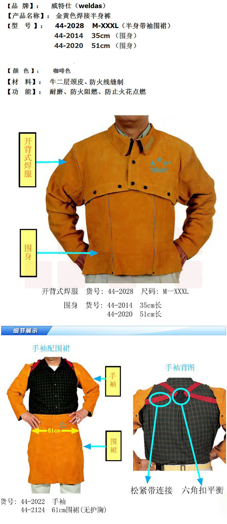 威特仕 / WELDAS 44-2020 金黄色纯牛皮皮围身51cm长皮围身与开背式焊服配套使用 1件