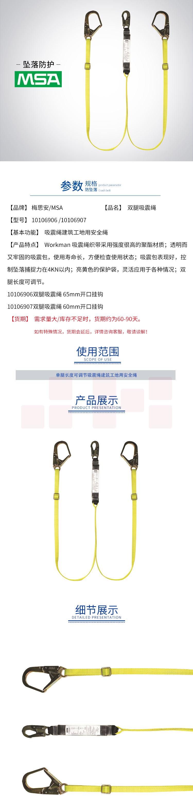 梅思安/MSA 10106906双腿吸震绳 66mm开口挂钩