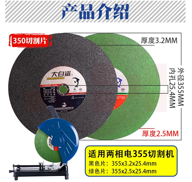 大白鲨 切割片350mm不锈钢金属砂轮片 沙轮片 355x2.5x25.4mm 30片/箱 货号:JC