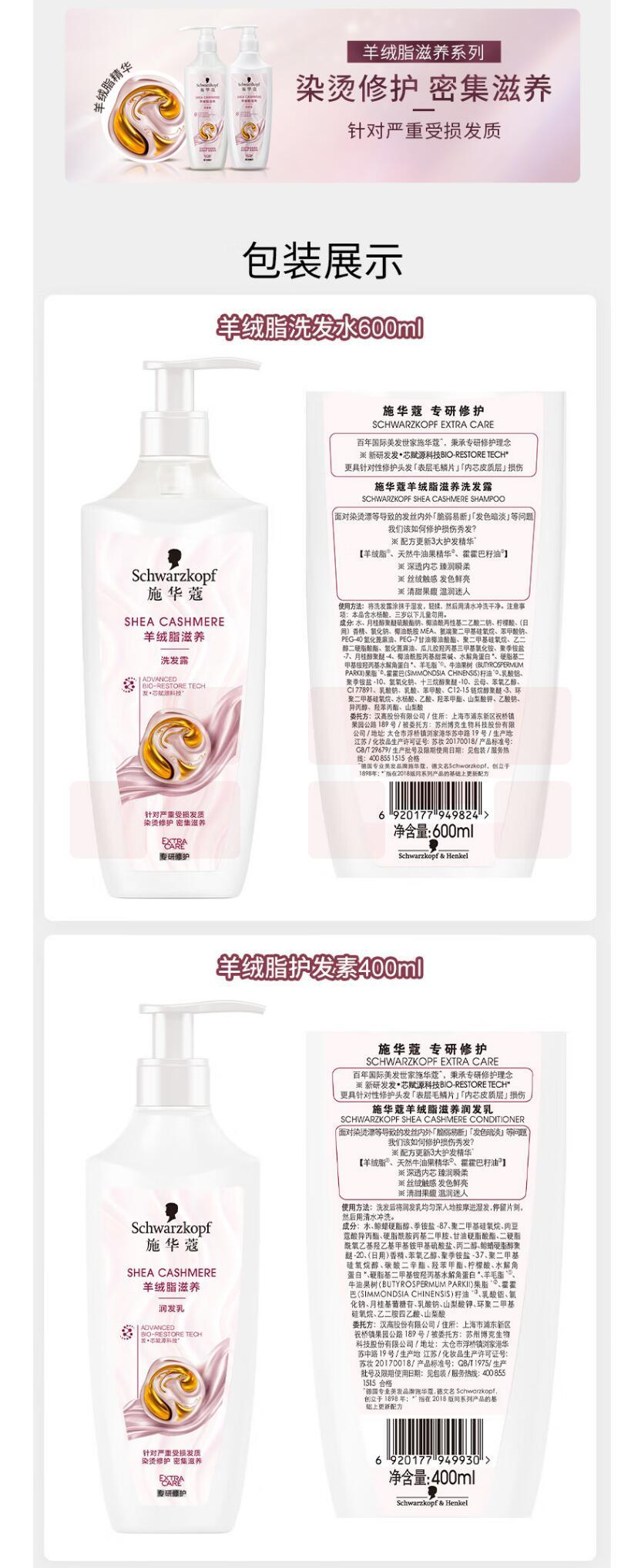 羊绒脂滋养洗护套装 施华蔻 600ml洗发水+400ml润发乳 白色