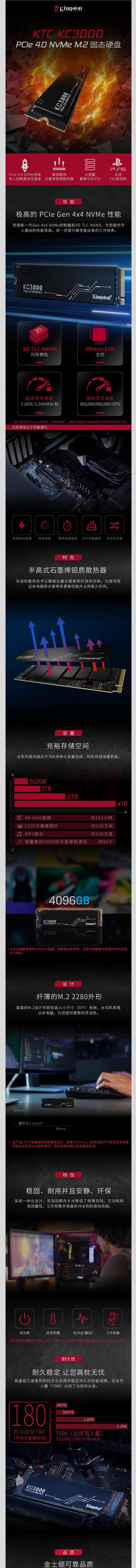 金士顿 KC3000系列 1TB SSD固态硬盘 M.2接口 (NVMe协议 PCIe 4.0×4)
