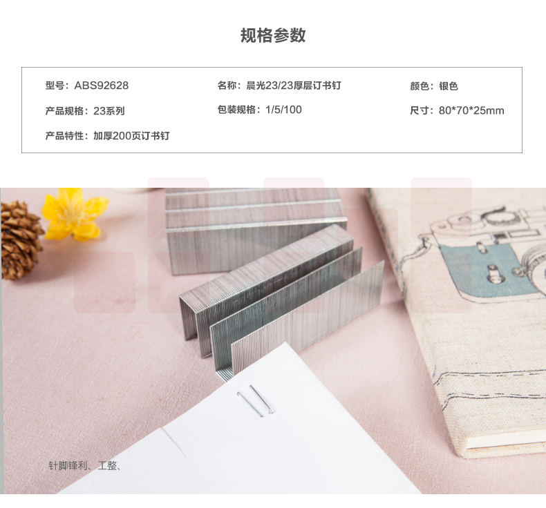 晨光 23/23号厚层订书钉 易穿透订书针 重型订书钉1000枚/盒 5盒装ABS92628