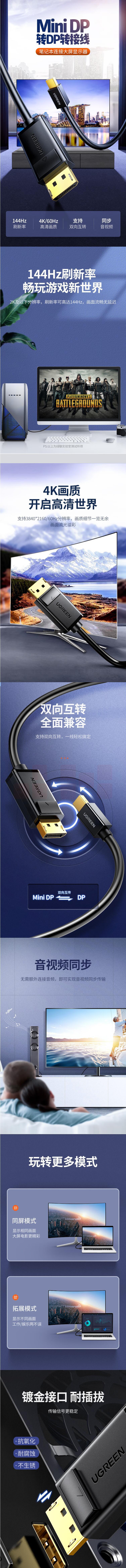 绿联 DP转DP转接线 4K dp转换器线 适用苹果笔记本连接显示器 黑色 1.5米 MD105 10477