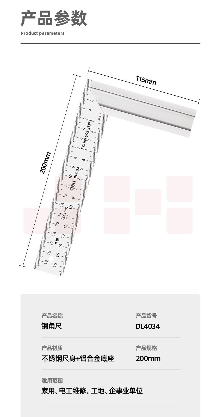 得力DL4034 钢角尺直角尺双刻度角尺90度尺拐尺L型木工尺宽座方直尺200mm
