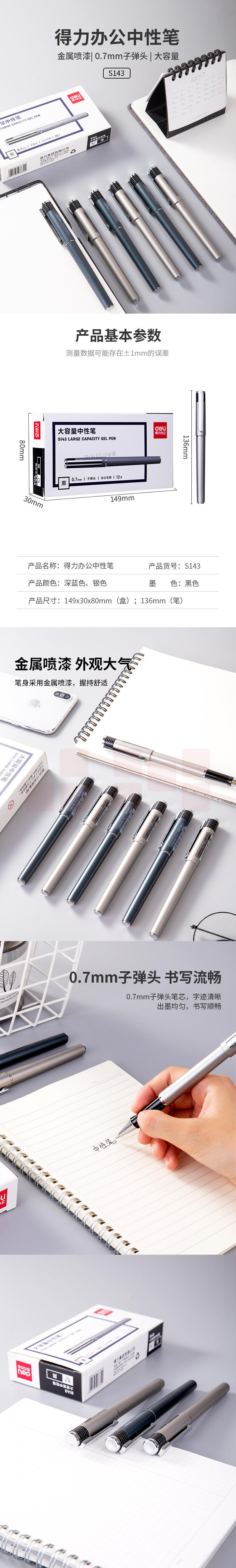得力 0.7mm中性笔签字笔 子弹头黑色DL-S143S 12支/盒;支