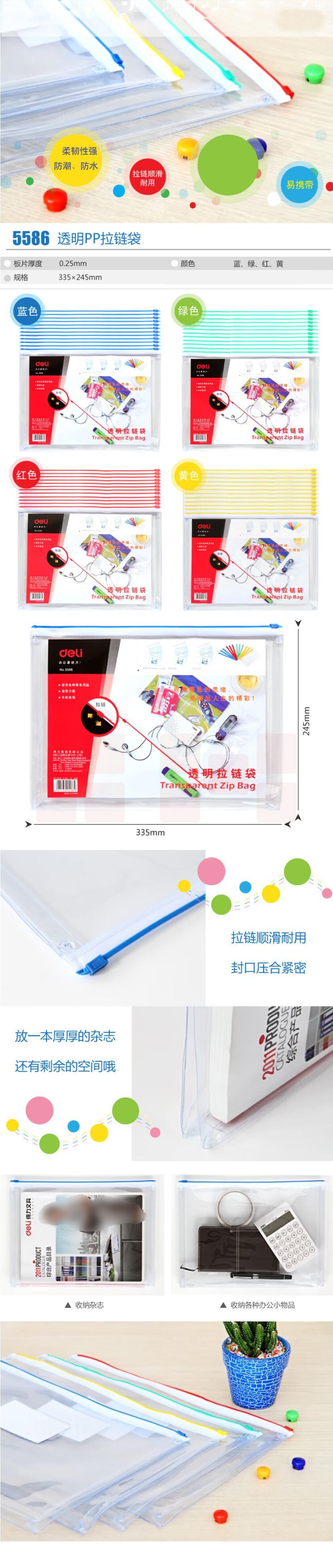 得力 A4透明文件袋拉链袋拉边袋5586 混色;个