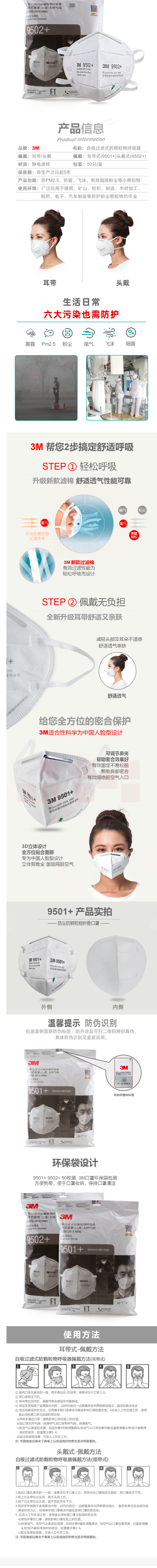 3M KN95口罩 9502+防雾霾 防飞沫PM2.5 头戴式 环保装 50只