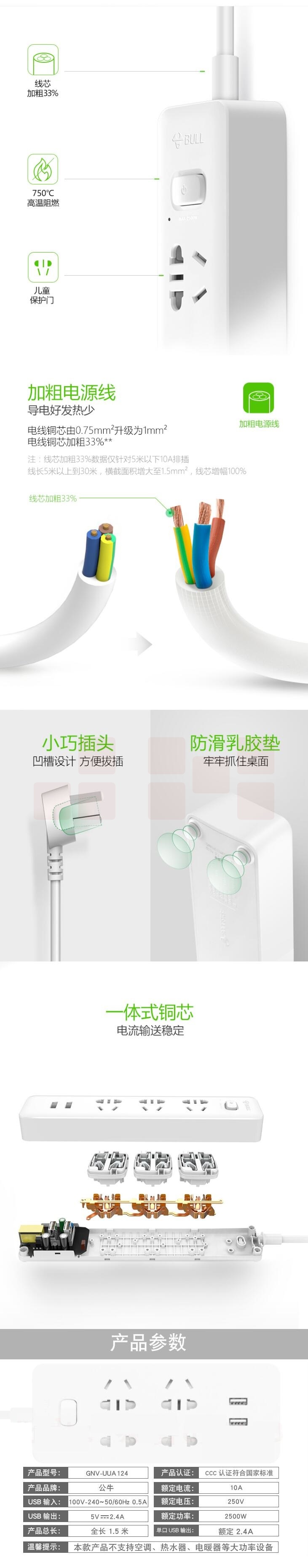 公牛 UUA124 USB插座智能插座充电插排拖接线板 1.5米 10A