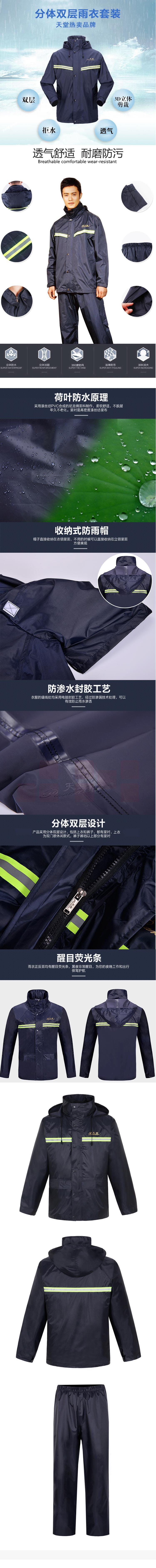 天堂伞 雨衣雨裤分体套装 前后夜光条双层防风雨 7AX藏青XL码