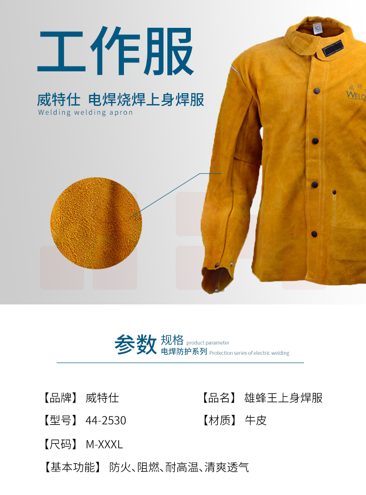 威特仕 44-2530 雄蜂王牛皮透气款电焊工服背部凉爽款上身烧焊焊服 XXL