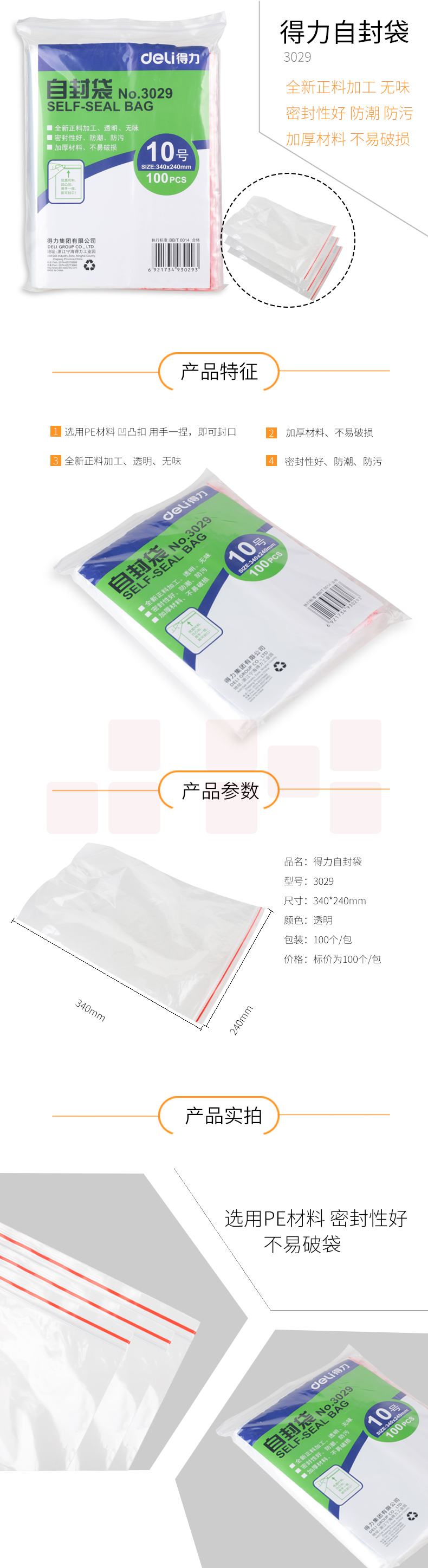得力 A4自封袋 340x240mm(透明)10号(100个/包)3029