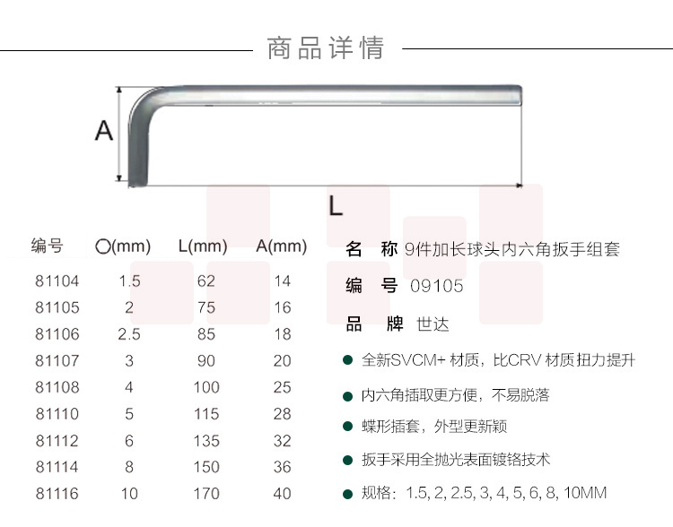 世达 1.5-10mm加长球头内六角扳手9件套装09105