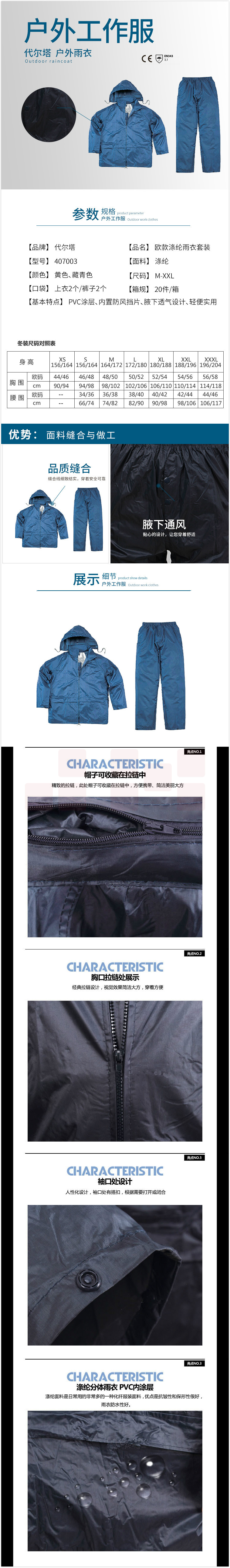 代尔塔 407003 XXL码 分体式涤纶雨衣套装 藏青色