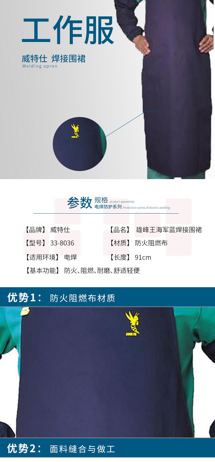 威特仕 / WELDAS 33-8036雄蜂王海军蓝电焊护胸围裙91cm长阻燃耐磨围裙 1件