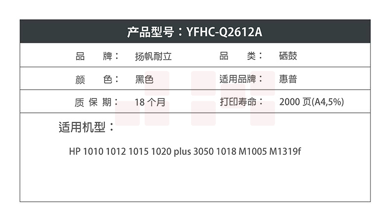 扬帆耐立 Q2612A 适用惠普HP 1010 1020 1018 M1005 M1319f 佳能LBP2900黑色