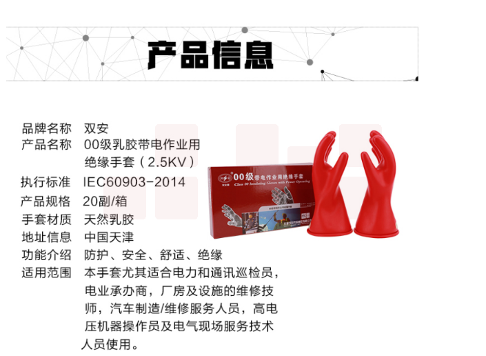 双安 2.5KV绝缘天然橡胶手套 低压500V带电作业用00级红色