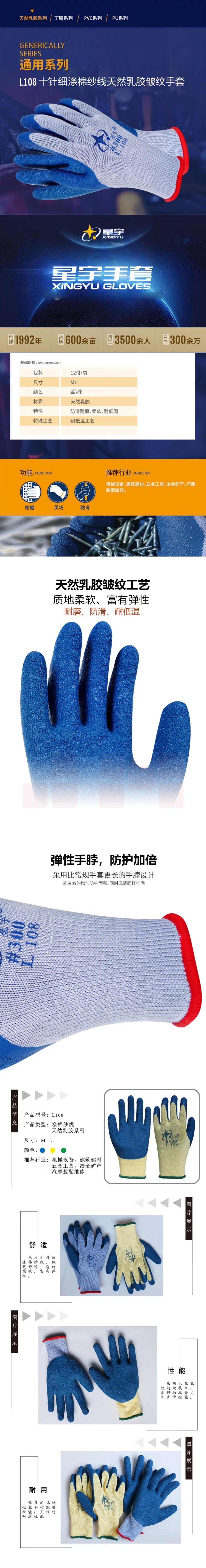 星宇L108 300浸胶手套 耐磨防滑防水皱胶手套 12付/包
