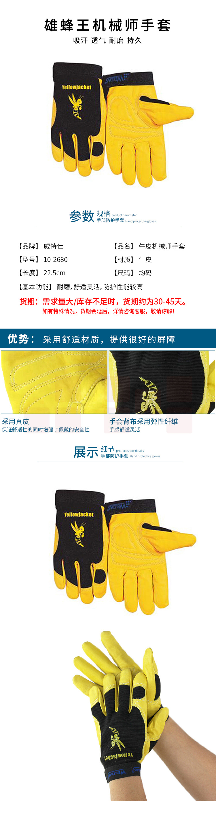 威特仕 10-2680 雄蜂王牛皮机械师手套有抗油防潮赛车手手套舒适灵活黄色 1副