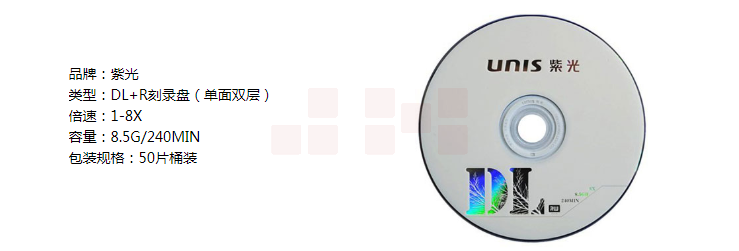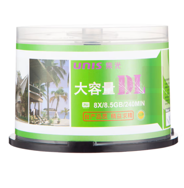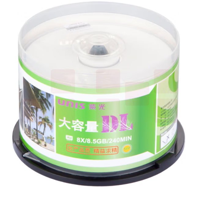 紫光(UNIS)DVD+R DL光盘/刻录盘 8速8.5G 单面双层 桶装50片 空白光盘