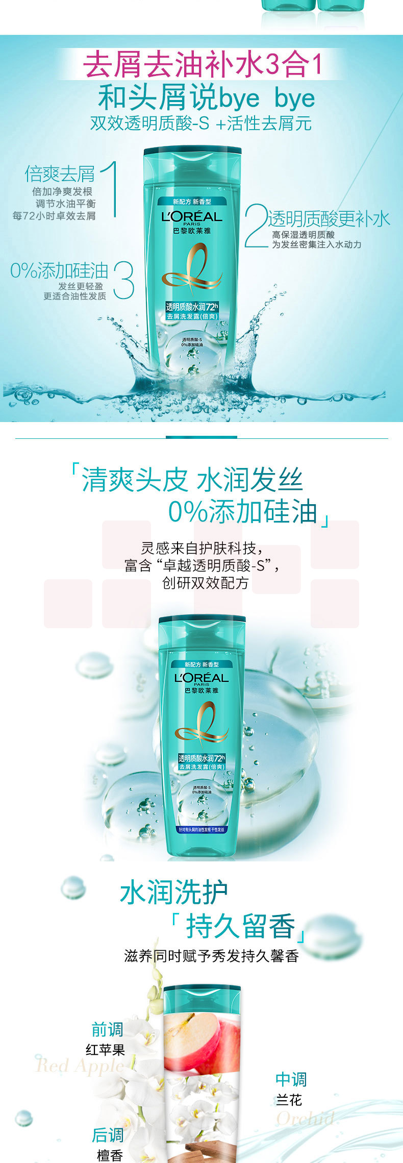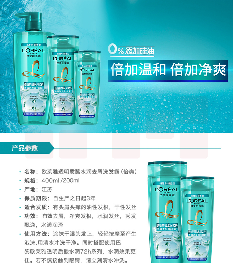 欧莱雅 透明质酸水润去屑洗发露 400ml (倍爽)