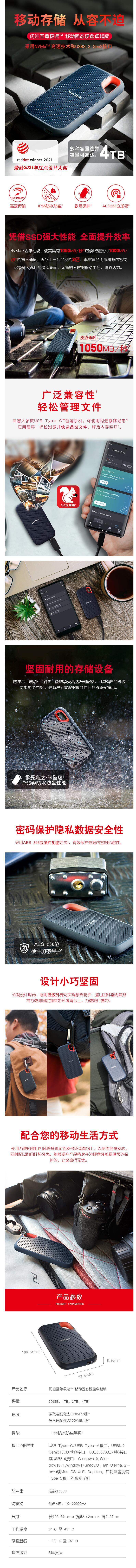 闪迪 4TB Type-c 移动固态硬盘 E61极速移动版 传输速度1050MB/s IP55等级三防保护